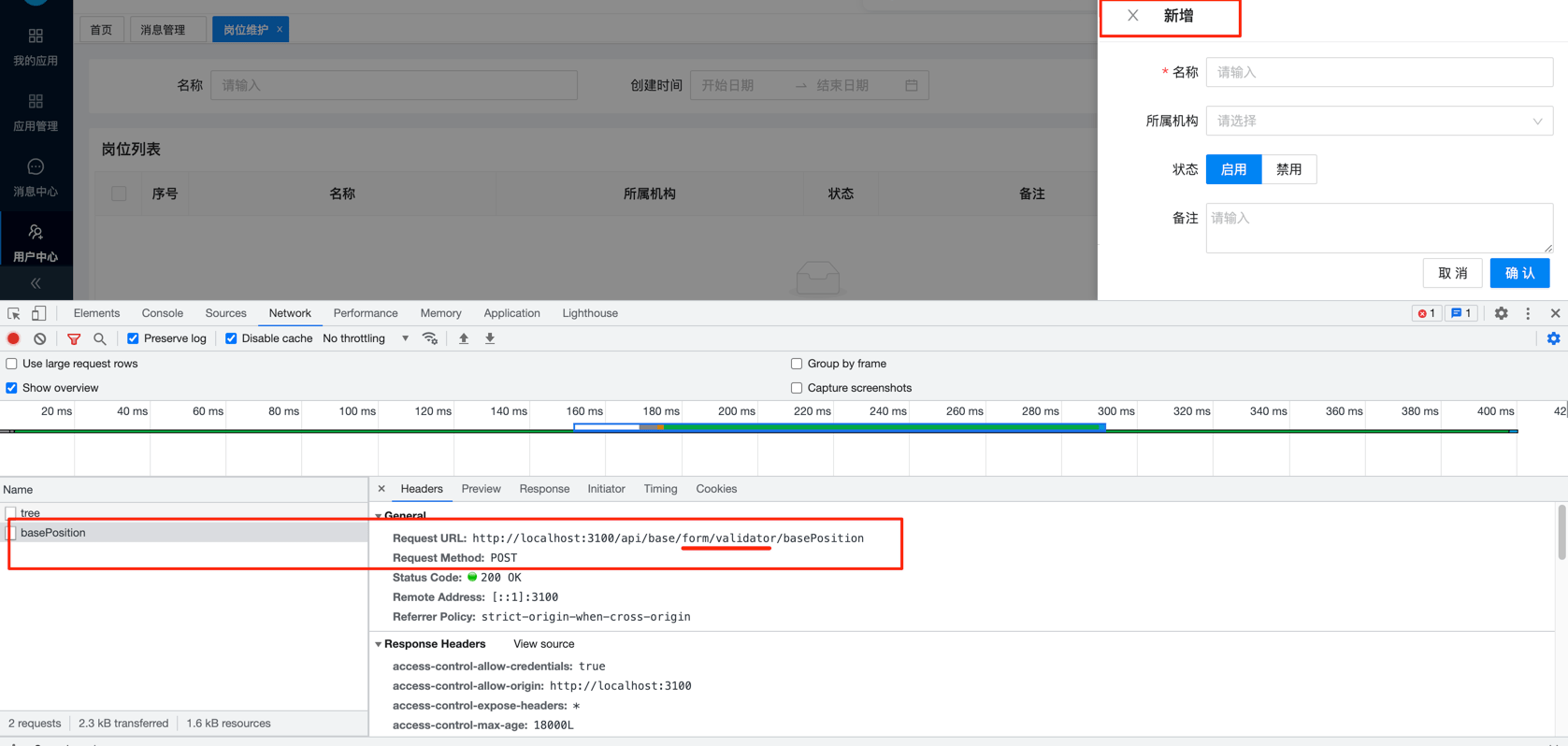 POST http://127.0.0.1:8760/api/base/positionPOST http://127.0.0.1:8760/api/base/position前端在进入新增页面时,会立即调用 http://127.0.0.1:8760/api/base/form/validator/position 接口, 获取保存组织接口的校验规则。