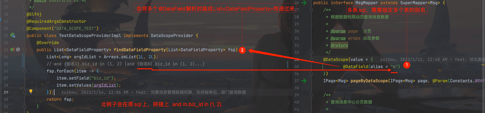 java@Override public IPage<Msg> pageByDataScope(IPage<Msg> page, Wrapper<Msg> wraps) { // 该方法不能加事务注解,否则会切换数据源失败! @Transactional(readOnly = true) return superManager.pageByDataScope(page, wraps); }@Override public IPage<Msg> pageByDataScope(IPage<Msg> page, Wrapper<Msg> wraps) { // 该方法不能加事务注解,否则会切换数据源失败! @Transactional(readOnly = true) return superManager.pageByDataScope(page, wraps); }- Mapper接口需要加 @DataScope 注解,同时配置@DataField,若pageByDataScope方法是多表查询,则可以配置多个@DataField,并为每张表指定别名。