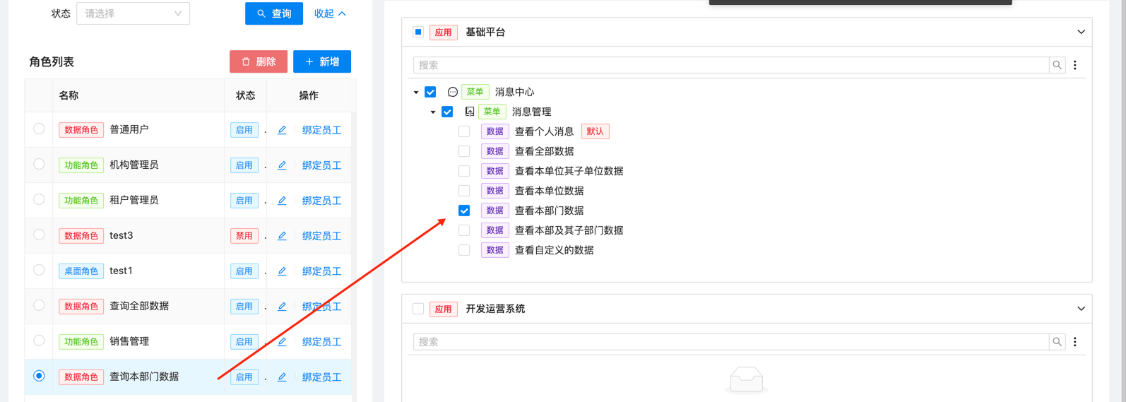 }授权:租户的使用者在基础平台 - 角色权限维护 页面给数据角色绑定数据权限资源,并给角色绑定员工。