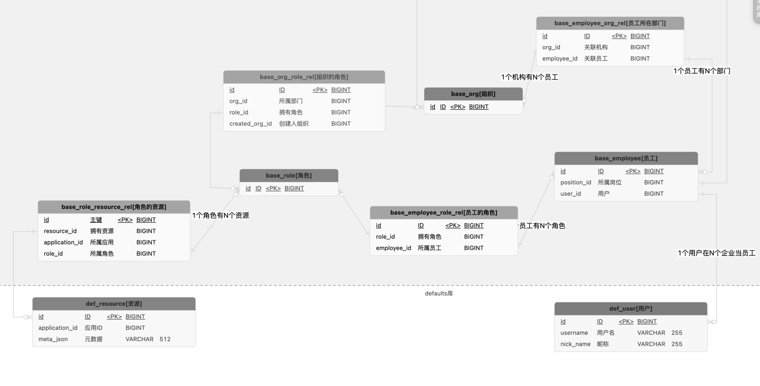 - 员工-角色-资源:传统的RBAC0模式,一个员工在不同的场景下可以拥有不同的角色,每个角色拥有不同的资源。