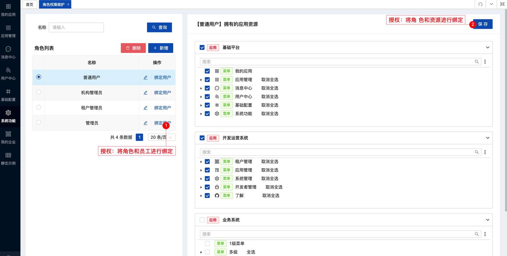 企业给自己内部员工授权:租户管理员在基础平台 - 系统功能 - 角色权限维护 页面先配置角色拥有的权限,然后绑定用户。
