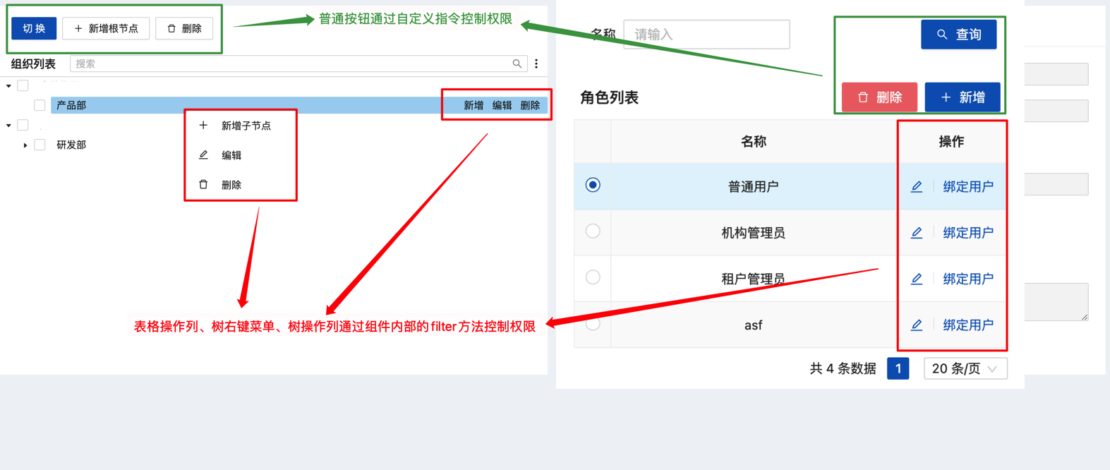 /anyone/visible/router接口控制。注意:该接口只返回用户拥有的权限,没权限的菜单和视图不会返回,所以但用户访问前端无权限的路由地址时,不会跳转到403页面,而是404页面。若你想实现无权限时跳转到403,确实访问了错误的路由时跳转到404,需要调整/anyone/visible/router逻辑,该接口将所有的菜单和视图都返回前端,并标记好哪些菜单无权限,然后前端控制跳转。按钮权限。表格外的按钮通过自定义指令控制,表格操作栏、树操作栏、树右键菜单通过内部封装filter控制。