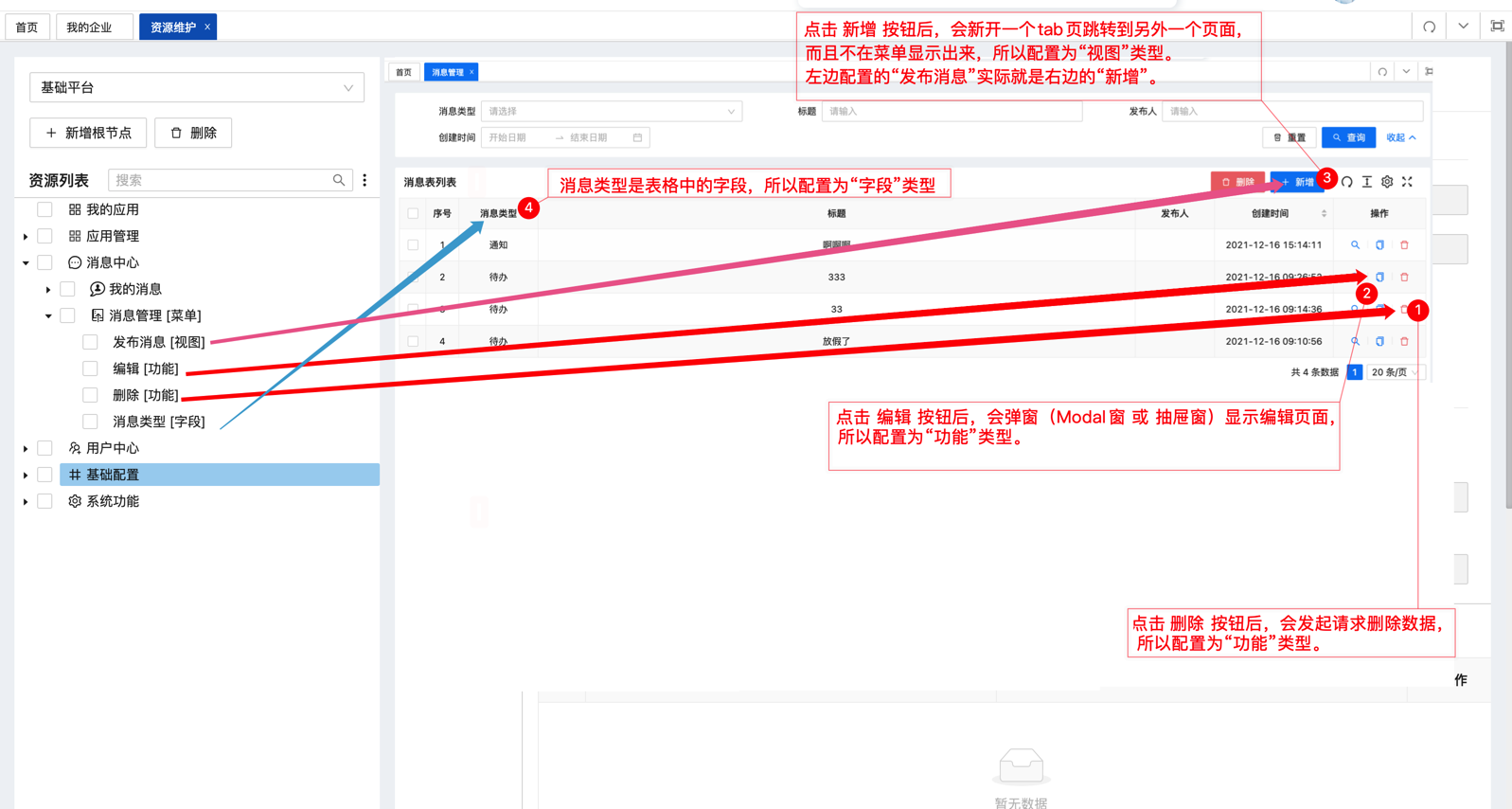 在资源维护页面配置资源时,资源的类型是由你们的业务决定的!如:发送消息(新增),若你希望弹窗后发送消息,可以将类型设置为功能,但希望新开tab页,则一定要将类型设置为视图。