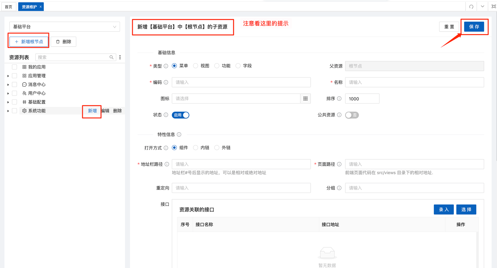 - 若你的接口地址发生了变更,需要重新在此资源维护页面配置新接口!!! 如:第一版配置了 /menu/save 接口,后期调整改为 /menu/saveMenu 接口,需要在此页面删除原来的 /menu/save 接口,然后重新选择 /menu/saveMenu ,并保存数据!!!