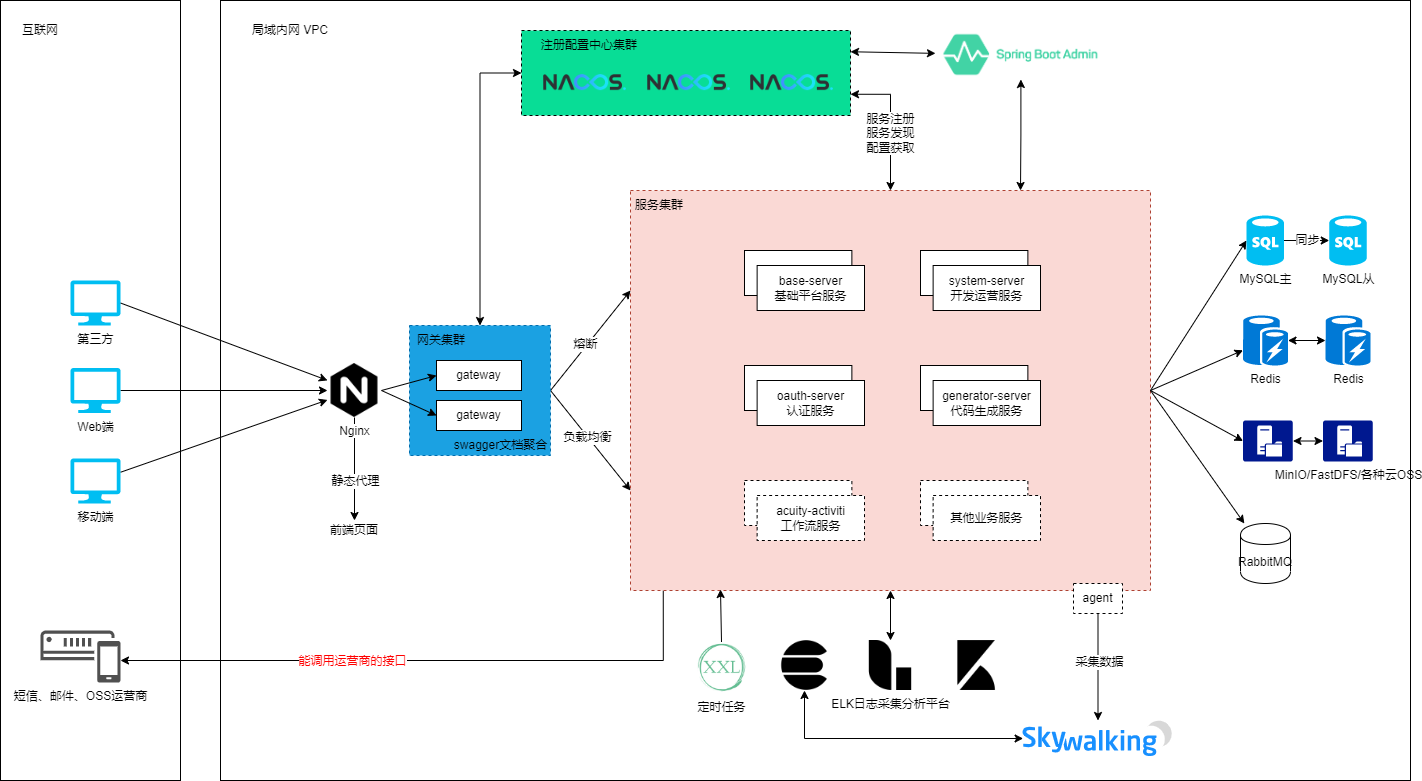 - 文件服务器:FastDFS 5.0.5/阿里云OSS/本地存储/MinIO/华为云/七牛云